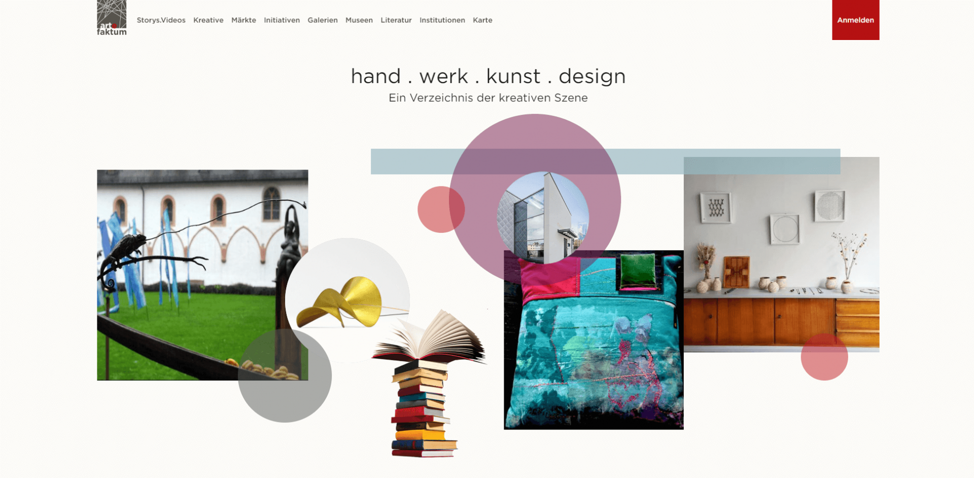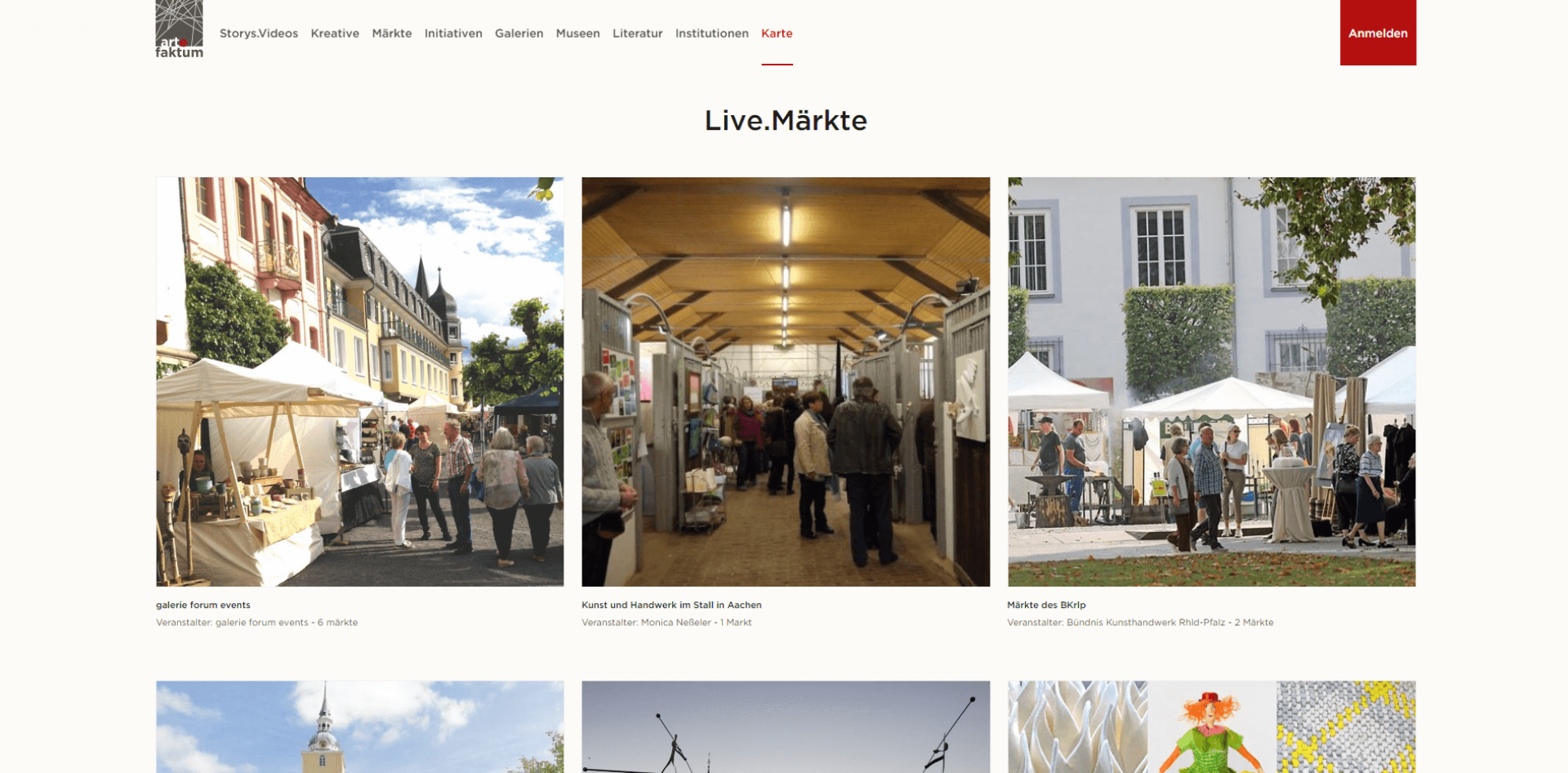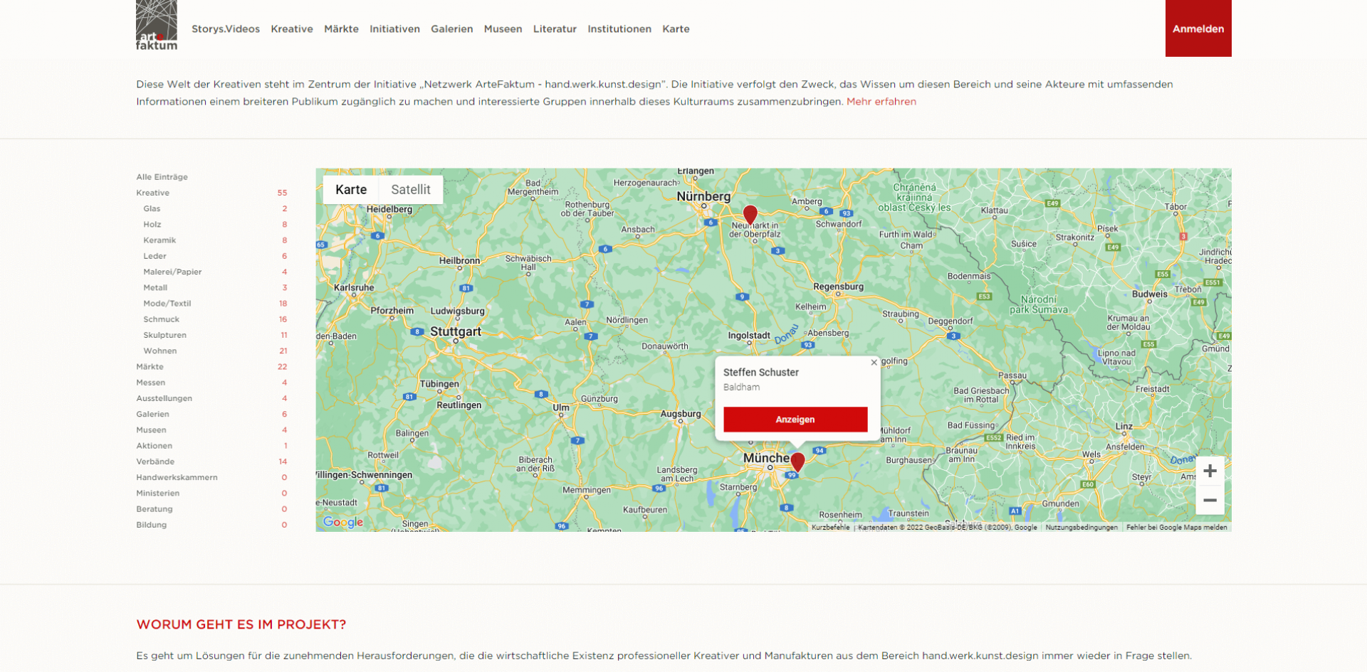Dabei kann der Besucher über eine Karte nach professionellen Kreativen und Manufakturen in allen Bereichen der Kunst suchen. Auch Ausstellungen, Museen und verschiedene Märkte in ganz Deutschland werden hier aufgelistet.